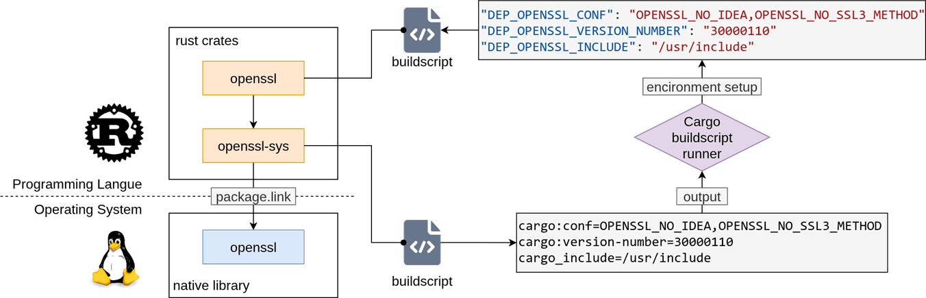 Perhaps the most complex challenge lies in handling the output of build.rs scripts. Cargo allows scripts to emit instructions (e.g., cargo::rustc-link-lib, cargo::rustc-cfg) and custom metadata (cargo::metadata). While Buck2 supports basic compiler flags, it historically lacked support for the links manifest key and the associated metadata propagation mechanism. This mechanism is vital for crates like openssl-sys, which use build.rs to detect system libraries and pass that information (via DEP_<NAME>_<KEY> environment variables) to dependent crates.